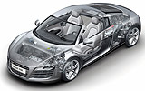 | Audi R8 este un coupe de doua locuri, cu motor de 420CP dispus central in spate, caroserie de aluminiu si tractiune integrala. Ca dimensiuni, este asemanator cu Lamborghini Striking sau Porsche 911 Turbo. Audi a creat R8, un Coupe cu performante dinamice excelente, prin raspunsul motorului si completarea sasiului, dar si un automobil sport la un pret pe masura.